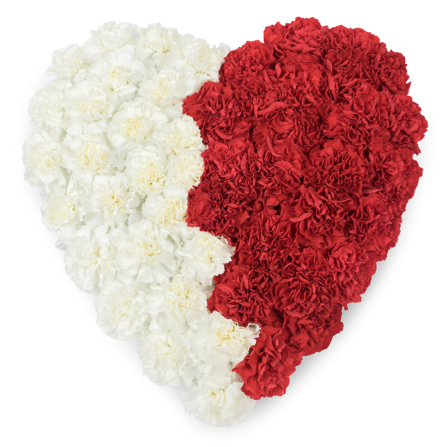 Celebrate love and admiration with our refined heart bouquet, artfully composed of hand-picked red and white carnations. Crafted to impress, each stem is chosen for its exquisite quality and vibrant color. The passionate red represents deep emotion, while the elegant white underscores purity and respect, making this arrangement a fitting tribute for any heartfelt occasion.